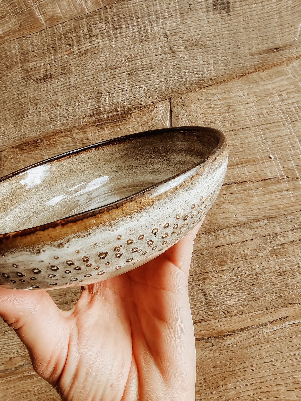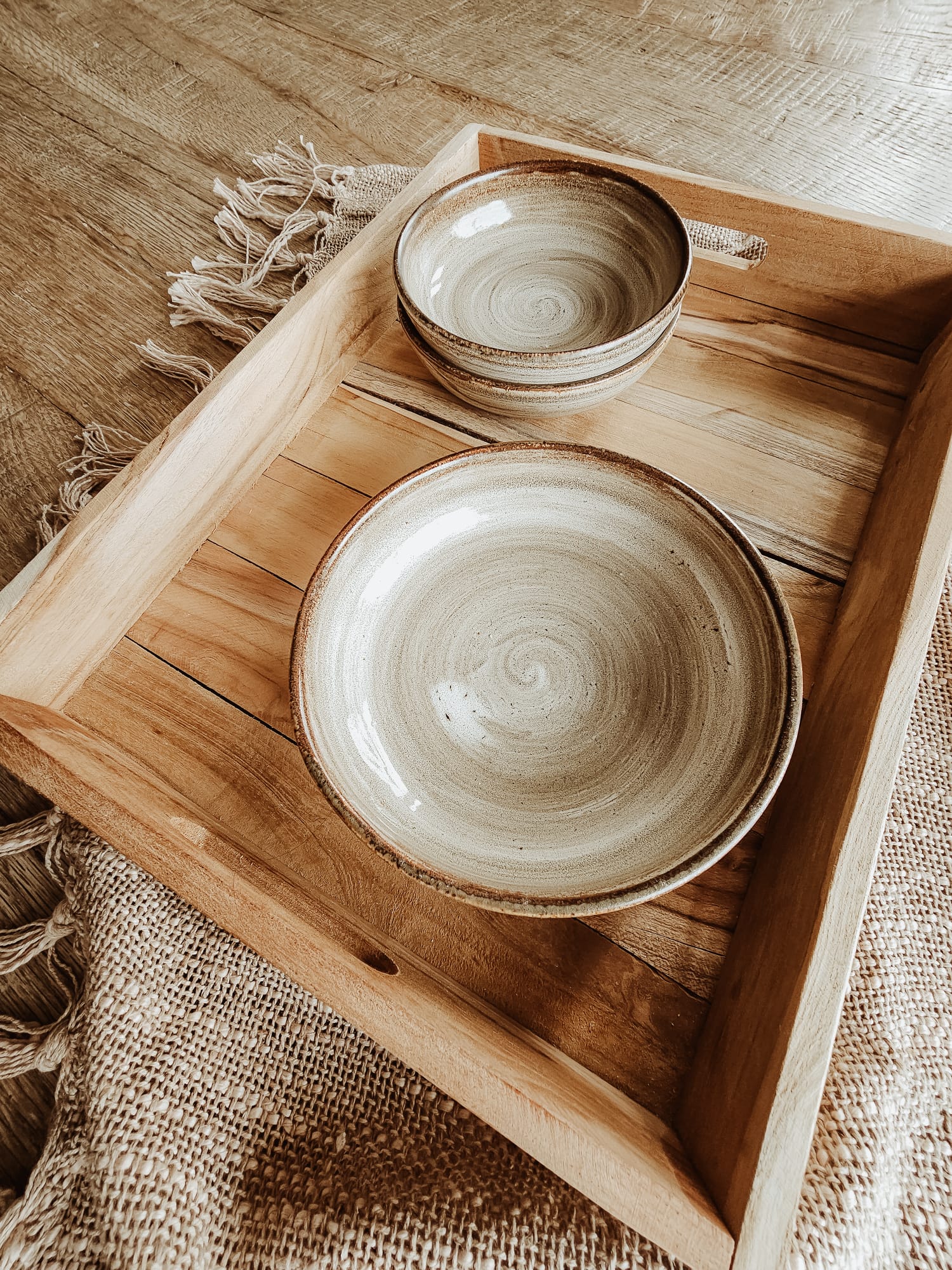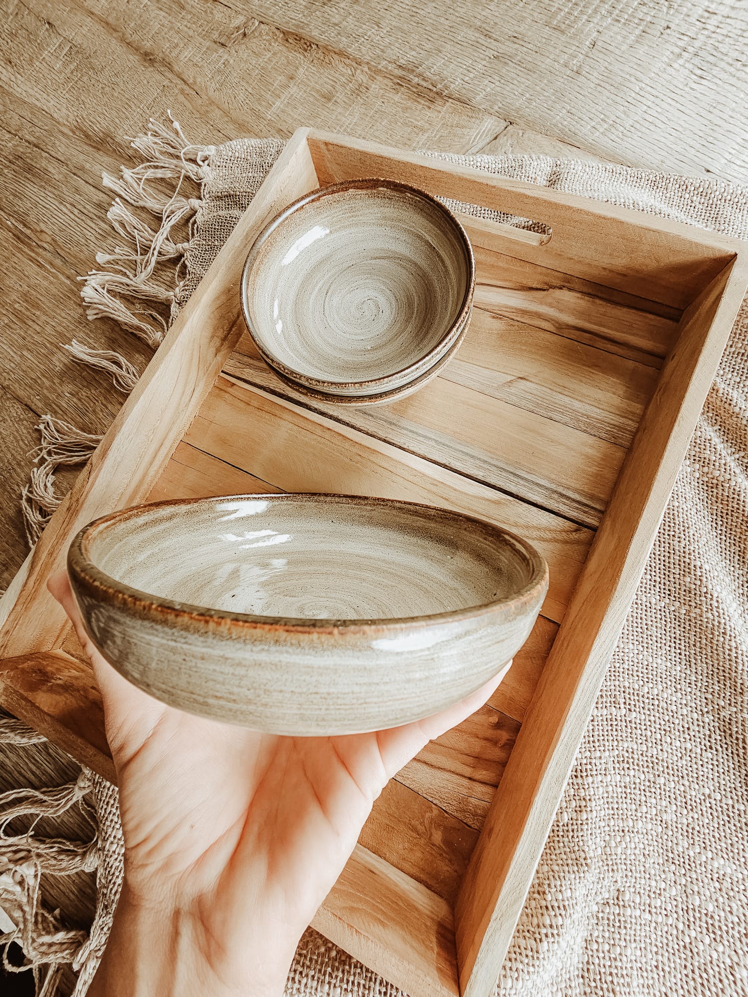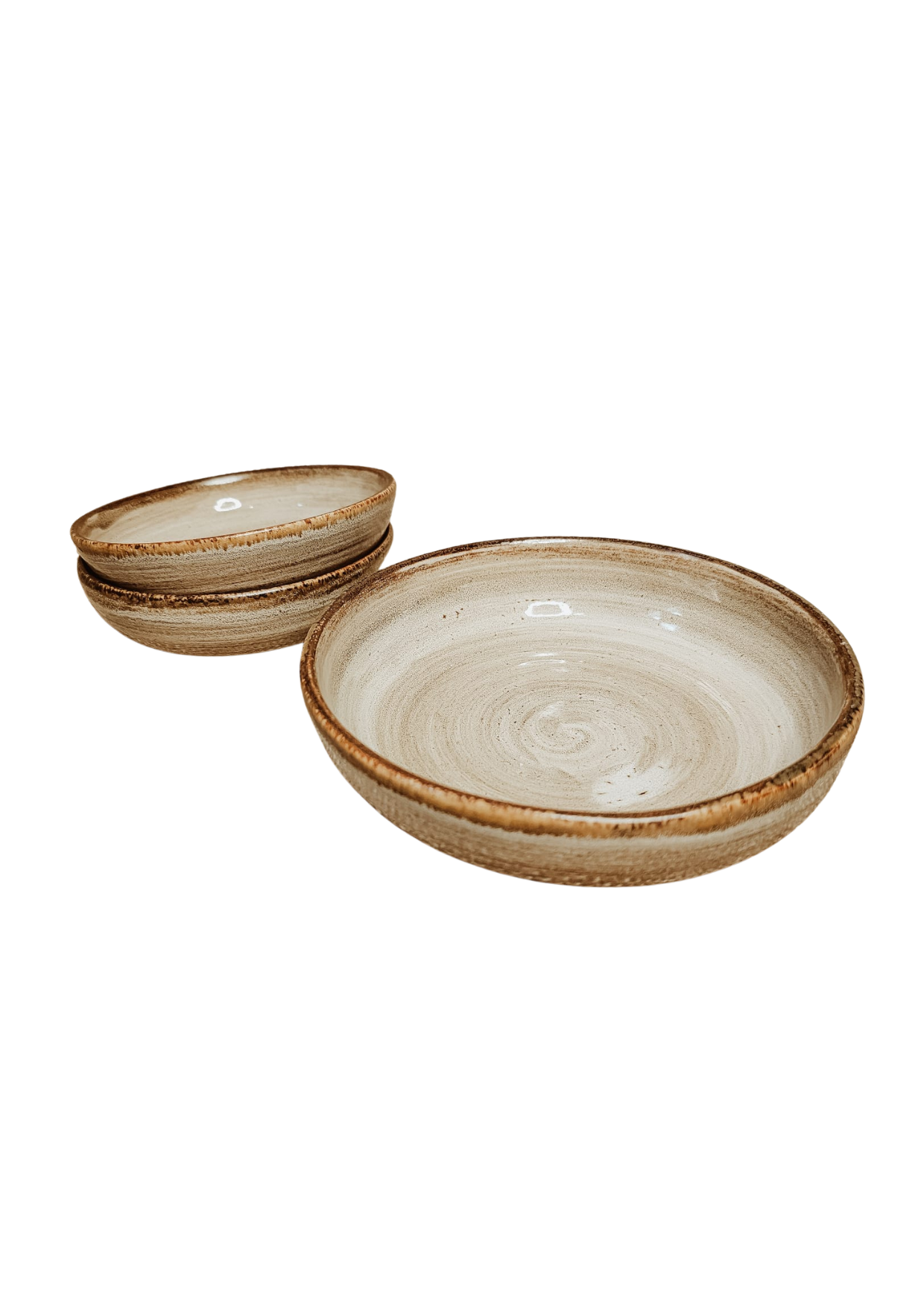 Set van één grotere kom en twee kleinere kommetjes. De verschillende glazuren werden spiraalgewijs aangebracht, wat elk stuk een speels en karaktervol uiterlijk geeft. Elk kommetje is met de hand gemaakt en dus helemaal uniek.