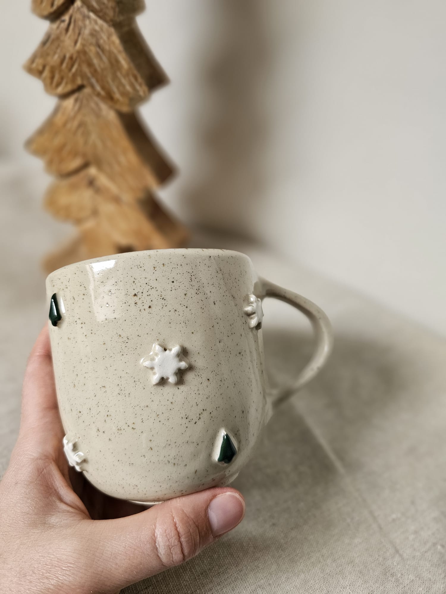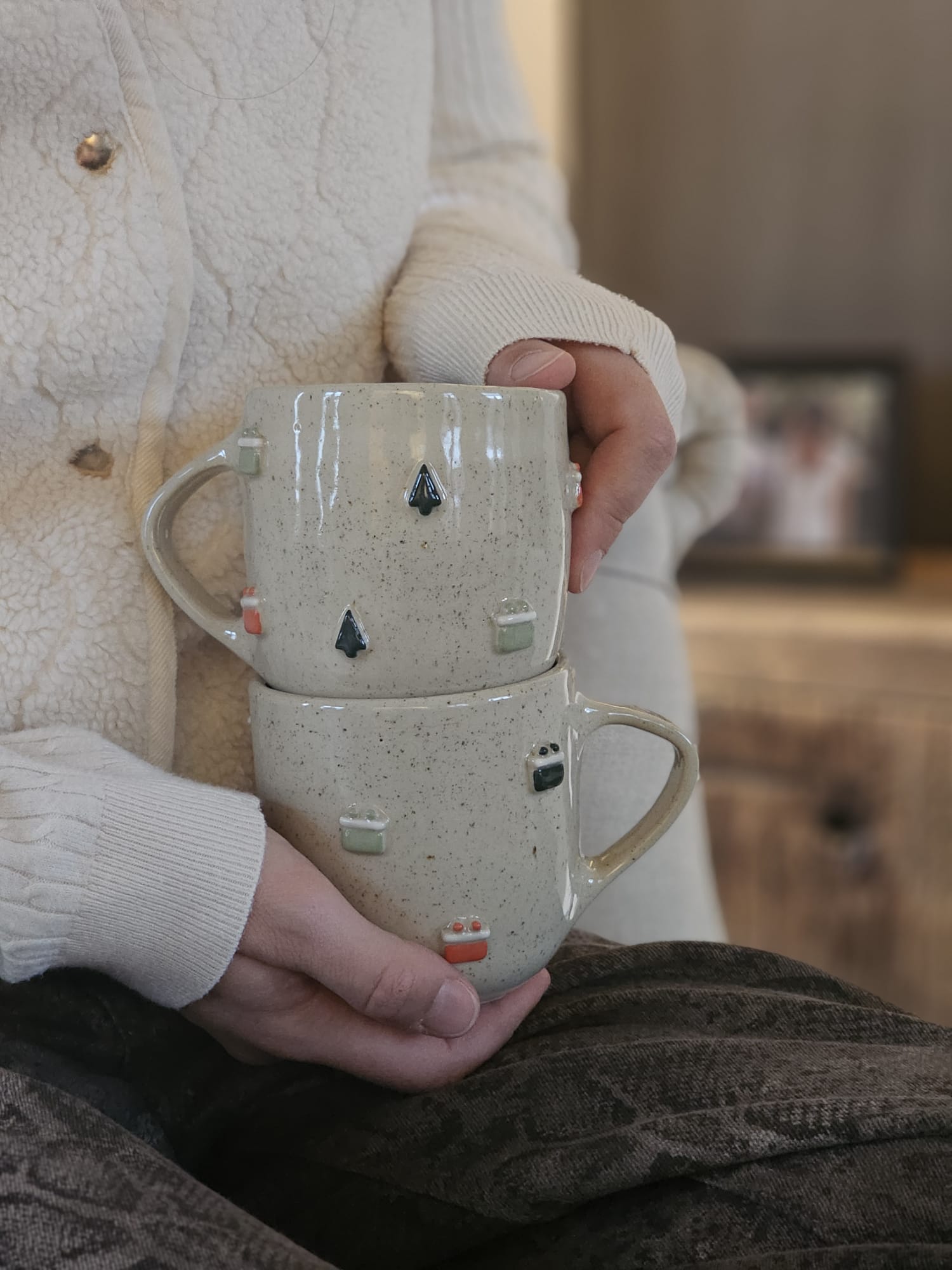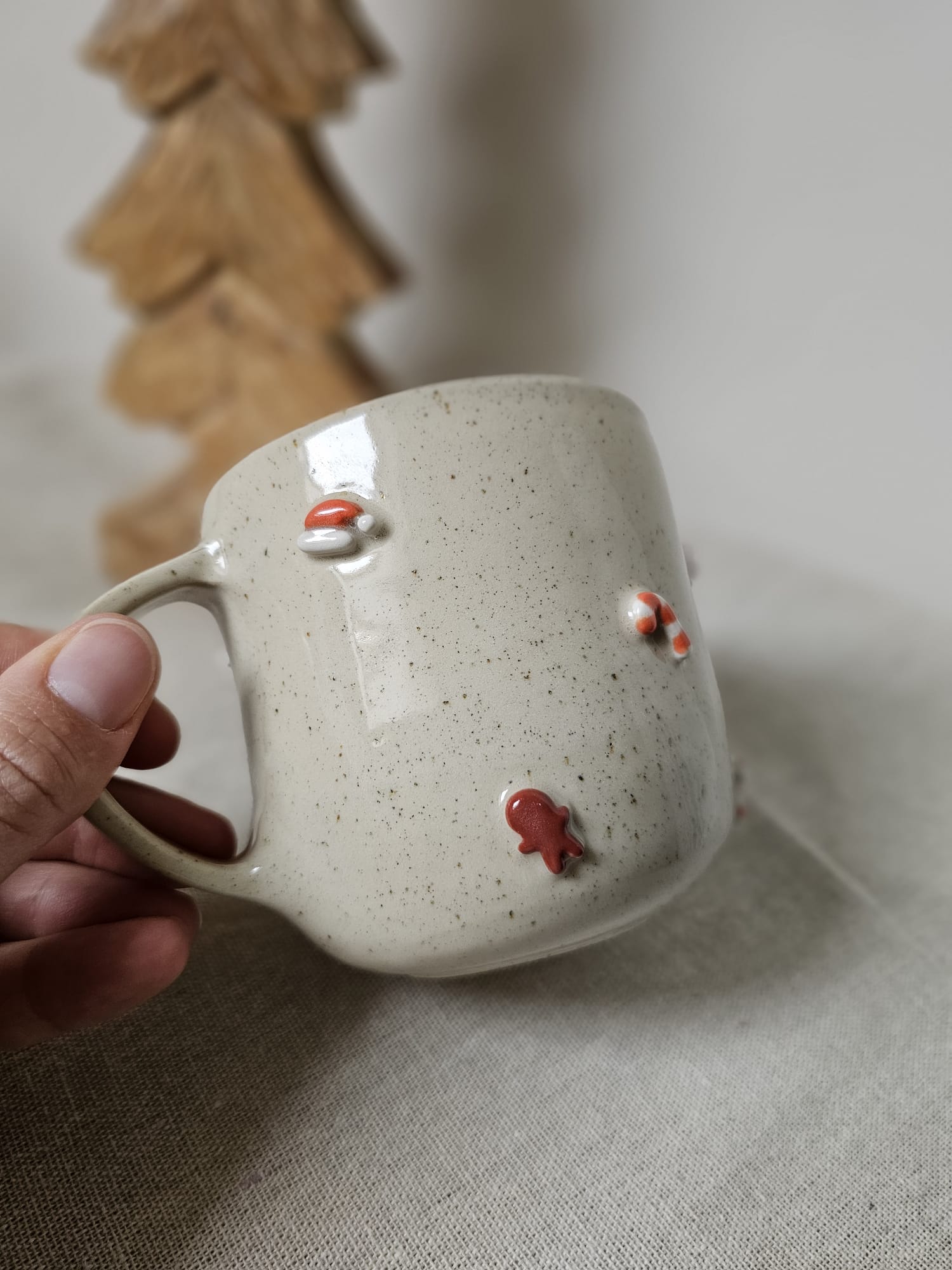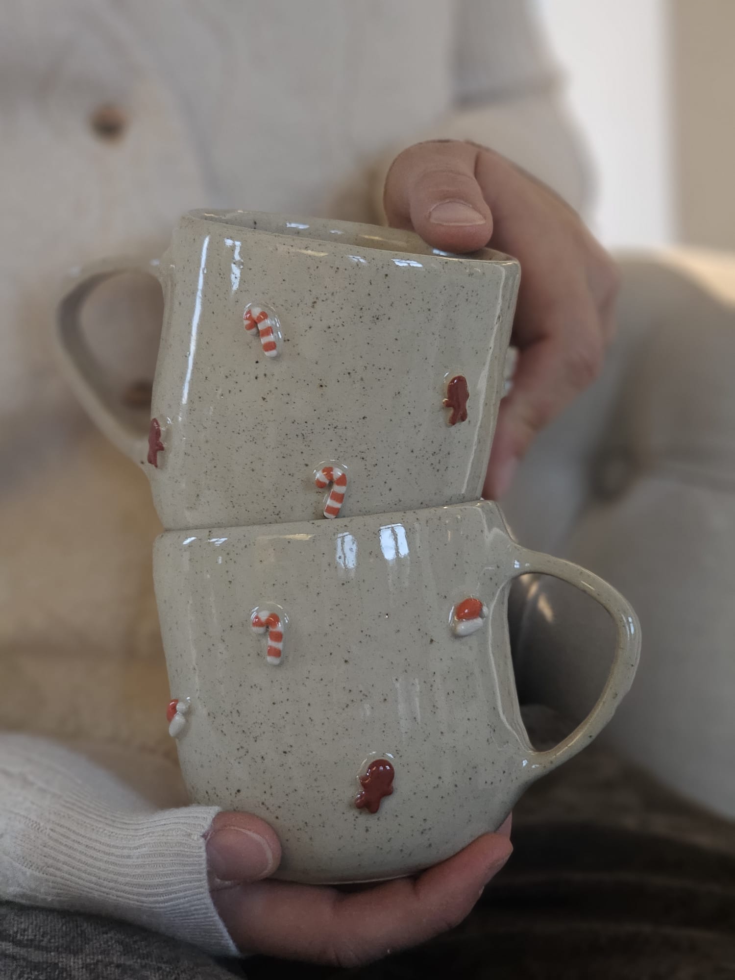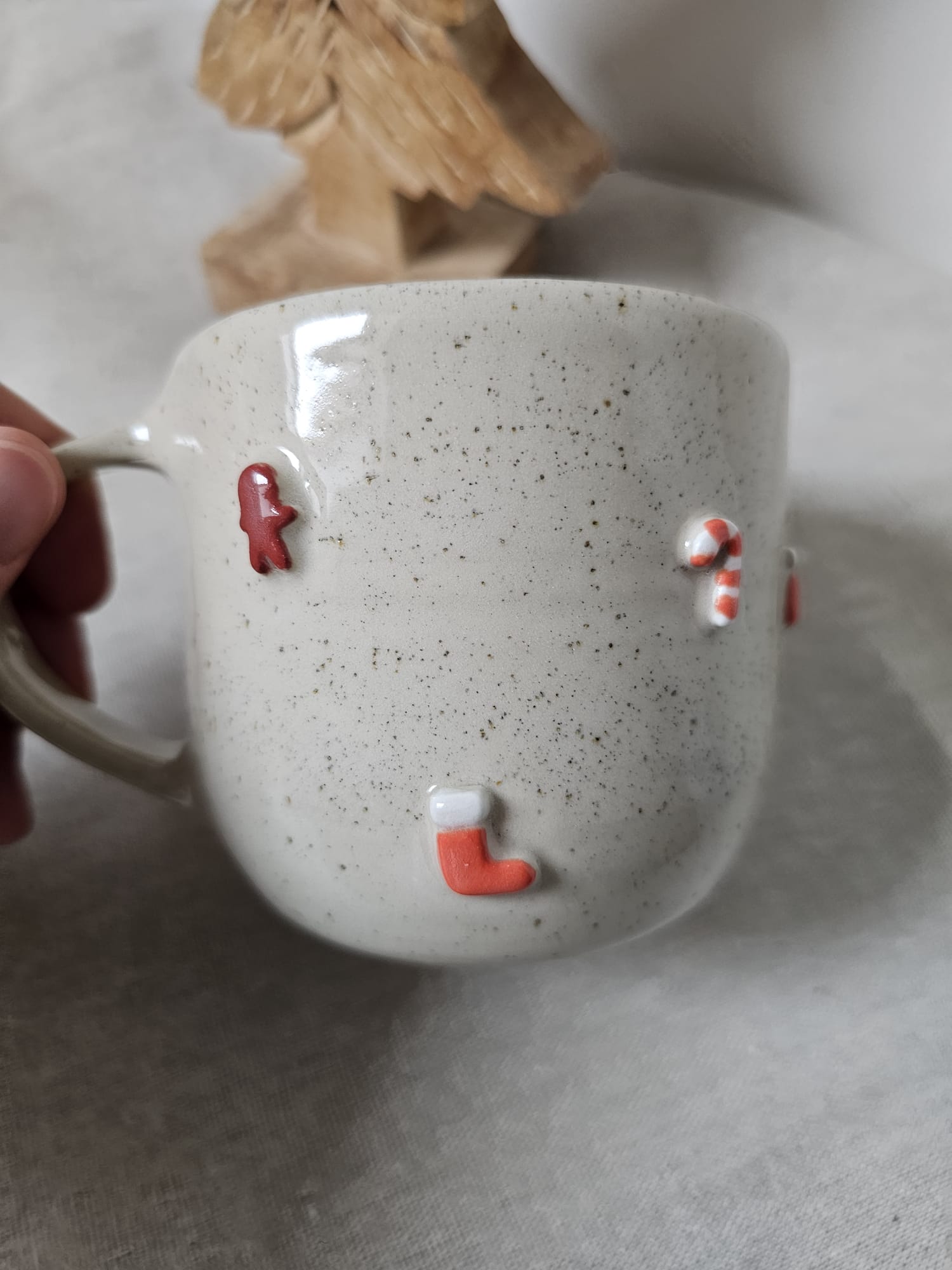Deze tassen werden gemaakt uit spikkelklei en afgewerkt met een transparante glazuur. Versierd met speelse kerstdecoraties, heeft elk exemplaar zijn eigen charmante karakter.