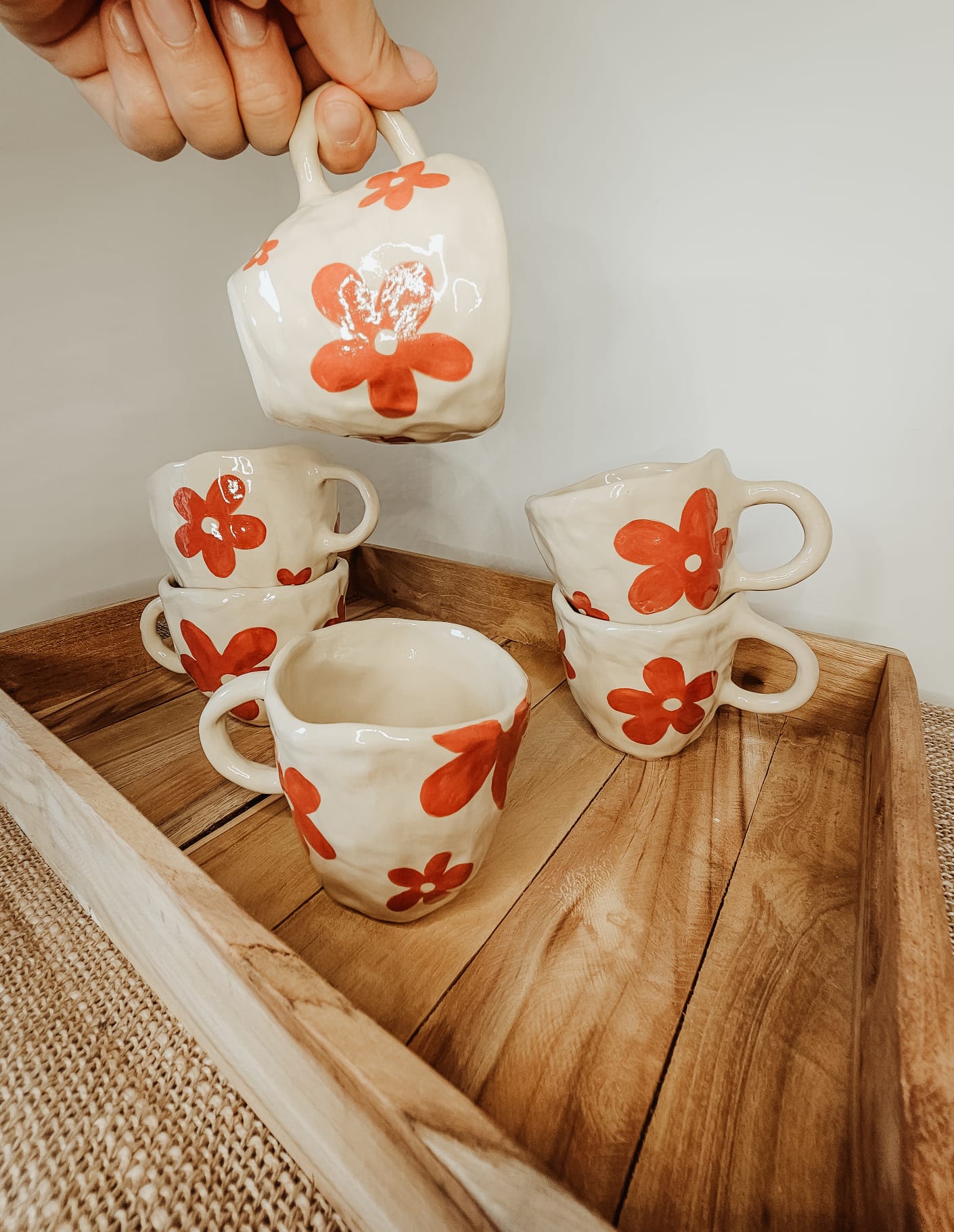 Deze tasjes zijn met de hand gevormd en dus niet op de draaischijf gemaakt, waardoor elk exemplaar een speels en uniek karakter heeft. Versierd met bloemen in een helder bruinrood, straalt elk stuk warmte en vrolijkheid uit.