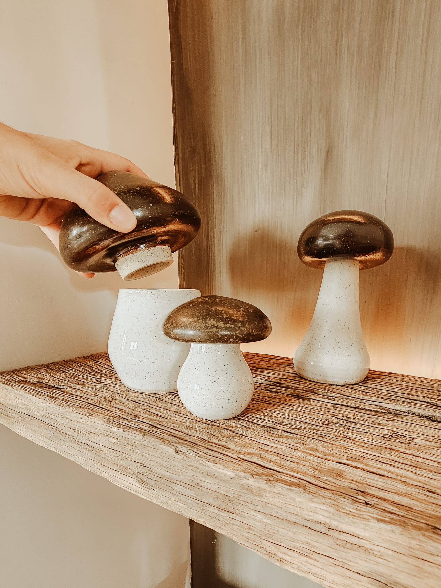 Dit betoverende drietal brengt de magie van het herfstbos tot leven in uw interieur. Elk hoedje is afneembaar. De grootste paddenstoel biedt ruimte om koeken, theebuiltjes of iets dergelijks in op te bergen.